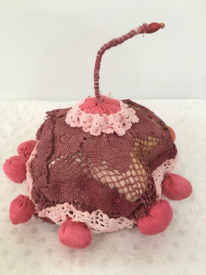 ‘Base Cell’ ← Previous Next → ‘Base Cell’, 2017. Recycled, reconstructed, hand dyed lace, embroidery and silk, hand stitched, polyfibre fill.H28xW15xD15cms.v2