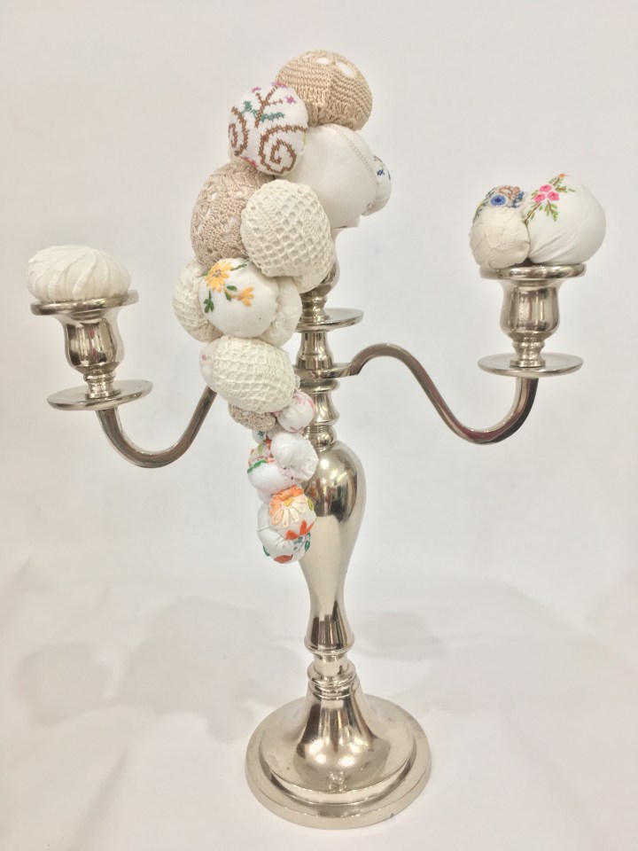 Illuminating Inheritance,2017,handstitched recycled embroideries,polyfibre fill,hot glue,found candelabra ← Previous Next →
