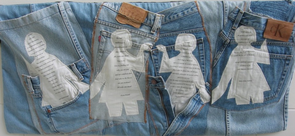 ‘Everybody’s Wearing Blue Jeans’,2009. H45xW62cms. Recycled denim jeans,applique,inkjet printing on fabric, applique,machine stitched. 2 ← Previous Next → ‘Everybody’s Wearing Blue Jeans’,2009, Recycled Denim Jeans, Inkjet print on cotton, applique, machine stitched. Like Loading...